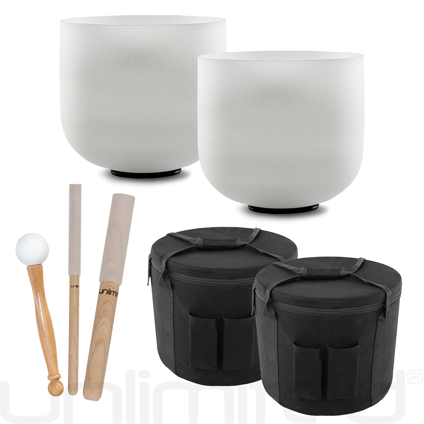 This listing includes two crystal bowls with rubber rings for each bowl, a rubber mallet, one small and one medium OG Atlantis Mallet, and two Dark Matter Singing Bowl Cases.